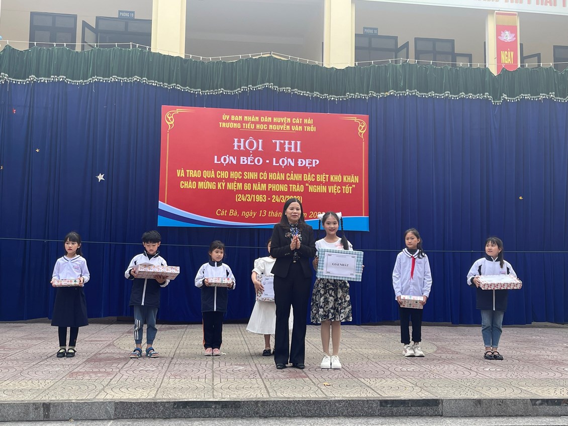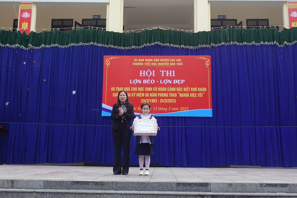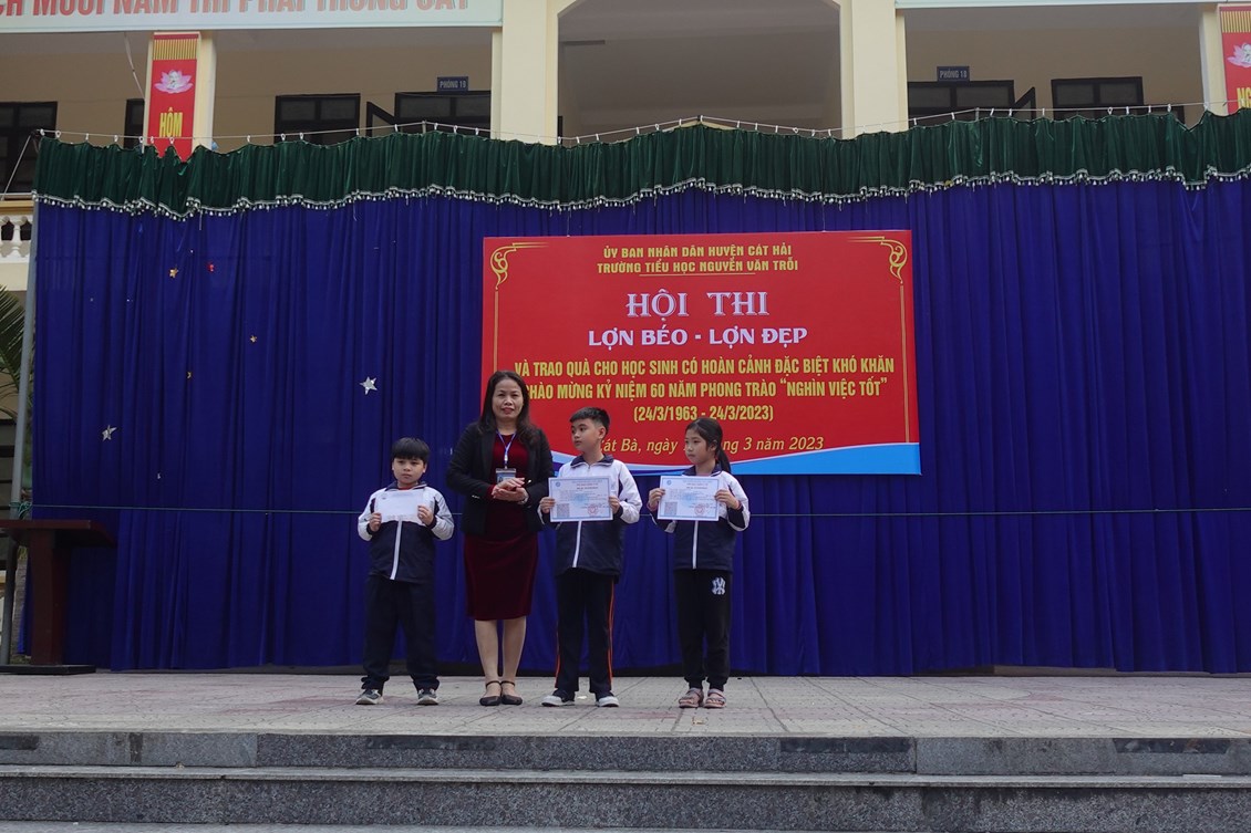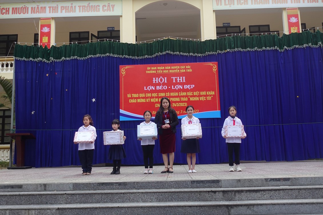 Với tinh thần ‘Lá lành đùm lá rách”, hội thi Lợn béo, lợn đẹp nhằm giúp đỡ phần nào cho các em học sinh có hoàn cảnh khó khăn, trường Tiểu học Nguyễn Văn Trỗi cũng có những món quà gửi tới các em học sinh có hoàn cảnh đặc biệt trong nhà trường. Em Tạ Hoàng Anh - lớp 2A2 nhận phần quà giá trị 500.000 đồng, 2 em Trắng Ngọc Anh - lớp 3A1 và Phạm Phúc Lâm - lớp 5A3 01 thẻ BHYT trị giá 564.000 đồng.
