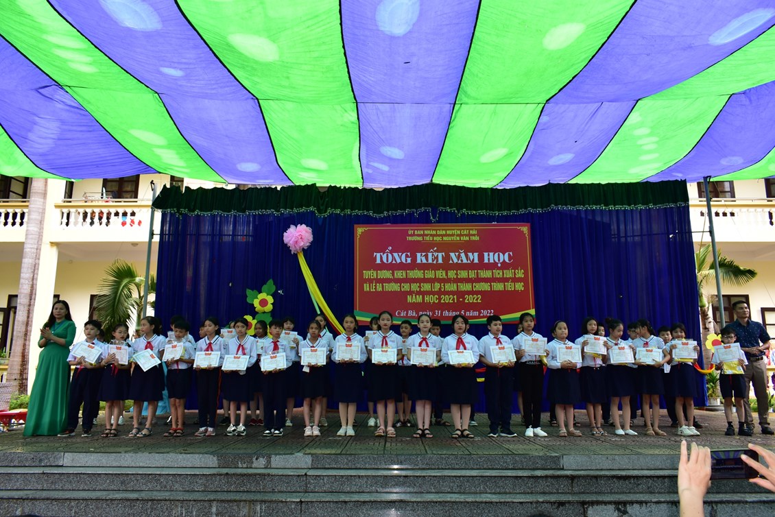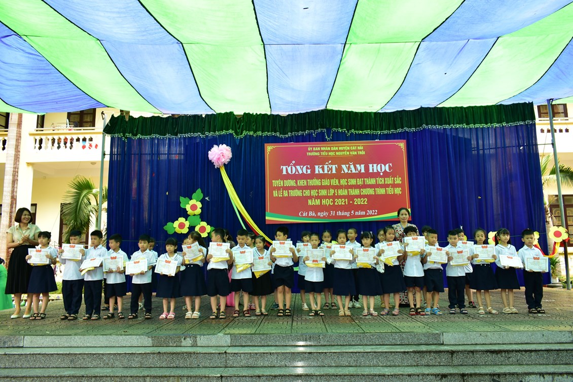 Tiếp sau không khí hân hoan đón nhận những tấm giấy khen, phần thưởng là thành quả của một năm học, các em học sinh cuối cấp được nhận Chứng nhận Hoàn thành Chương trình Tiểu học.